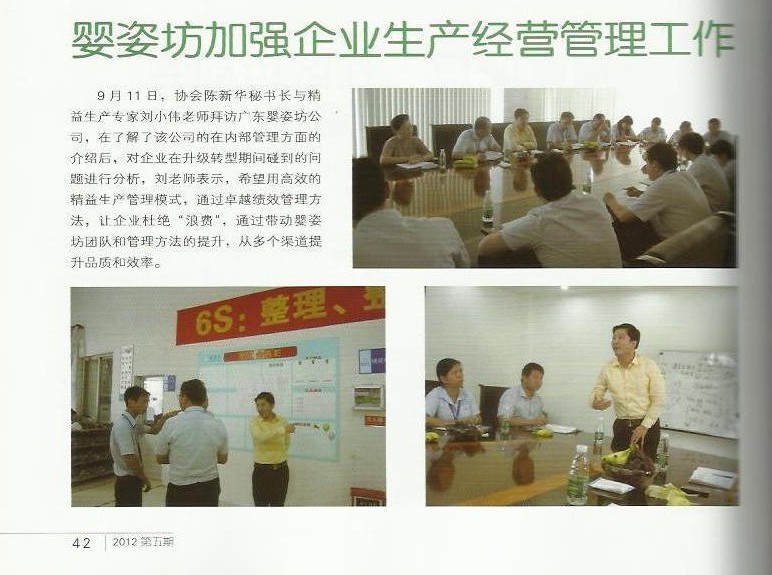 2012年9月11日,廣東省孕嬰童用品協(xié)會(huì)陳新華秘書長與精益生產(chǎn)專家劉小偉老師拜訪廣東嬰姿坊公司,在了解了該公司的在內(nèi)部管理方面的介紹后,對(duì)企業(yè)在升級(jí)轉(zhuǎn)型期間碰到的問題進(jìn)行分析,劉老師表示,希望用高效的精益生產(chǎn)管理模式,通過卓越績效管理方法,讓企業(yè)杜絕“浪費(fèi)”,通過帶動(dòng)?jì)胱朔粓F(tuán)隊(duì)和管理方法的提升,從多個(gè)渠道提升品質(zhì)和效率。